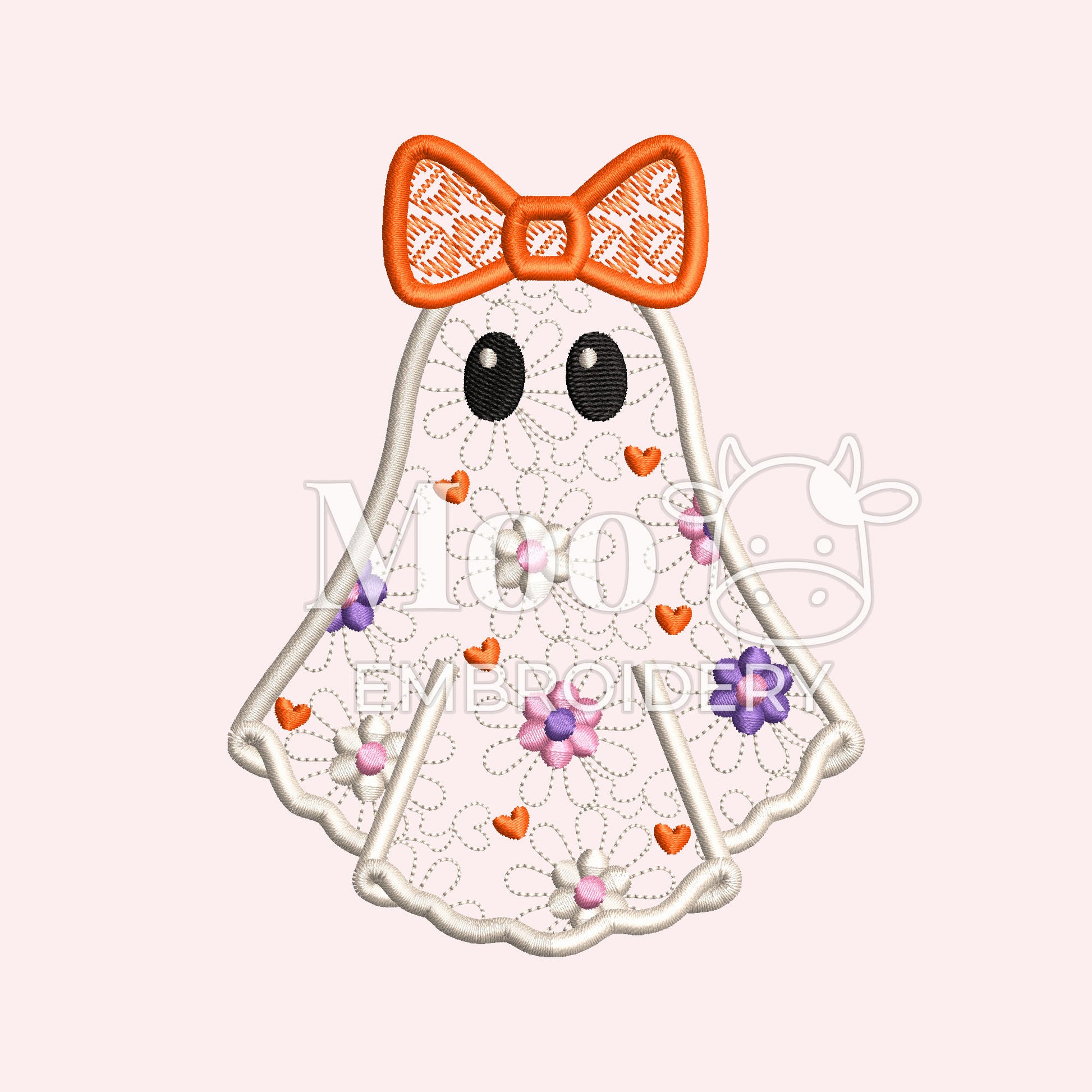 Cute Floral "Lace" Halloween Ghost with Bow Embroidery Design