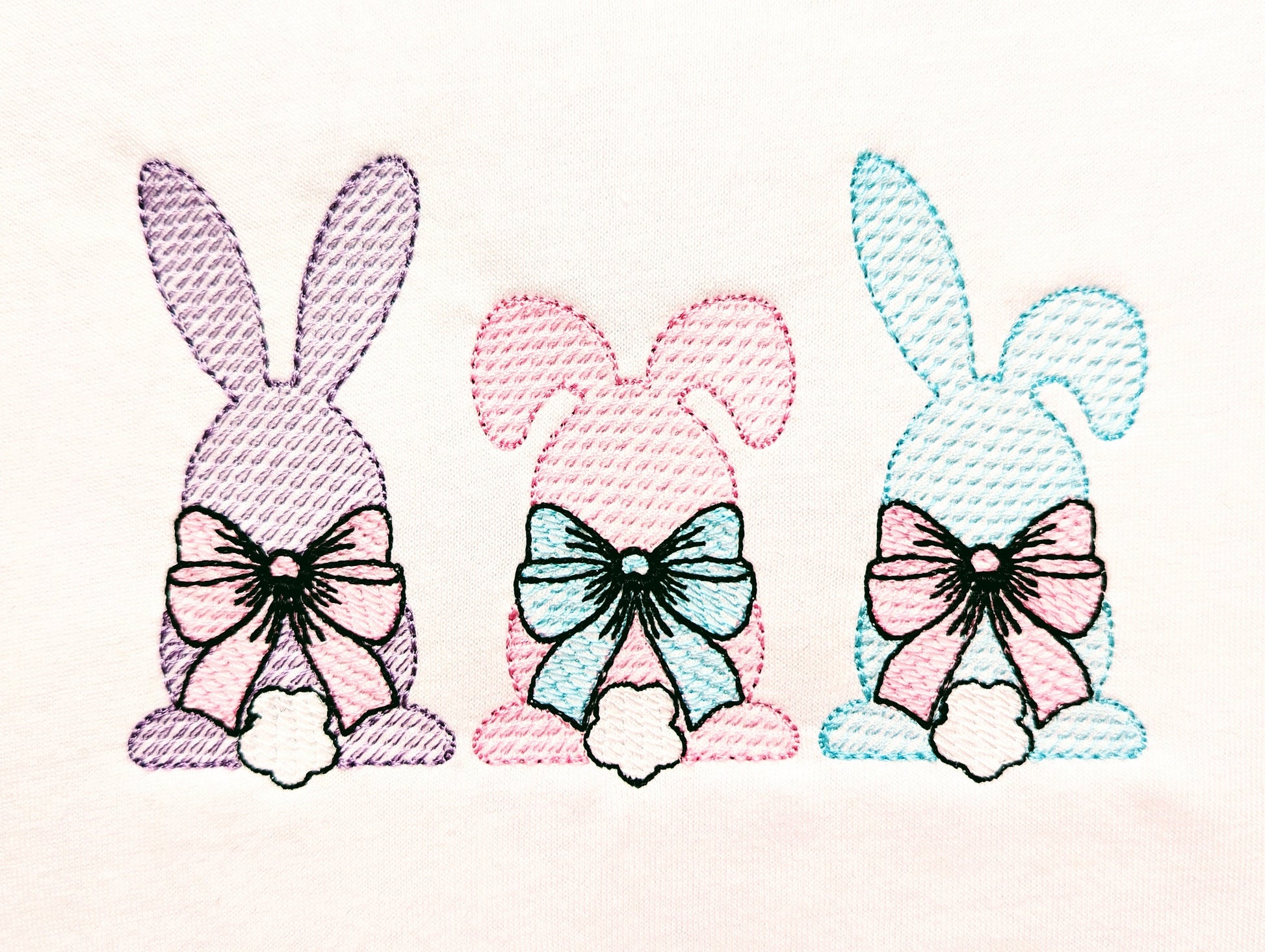 Easter Bunny Trio with Bow Embroidery Sketch Design