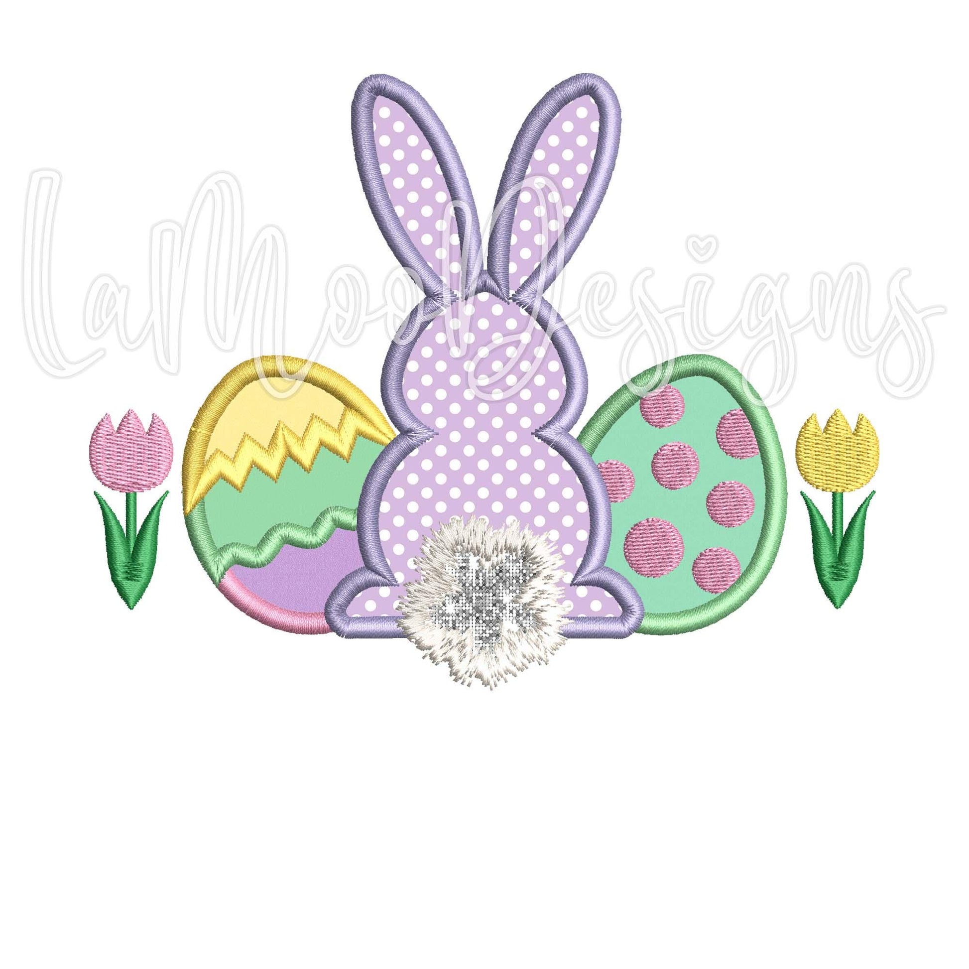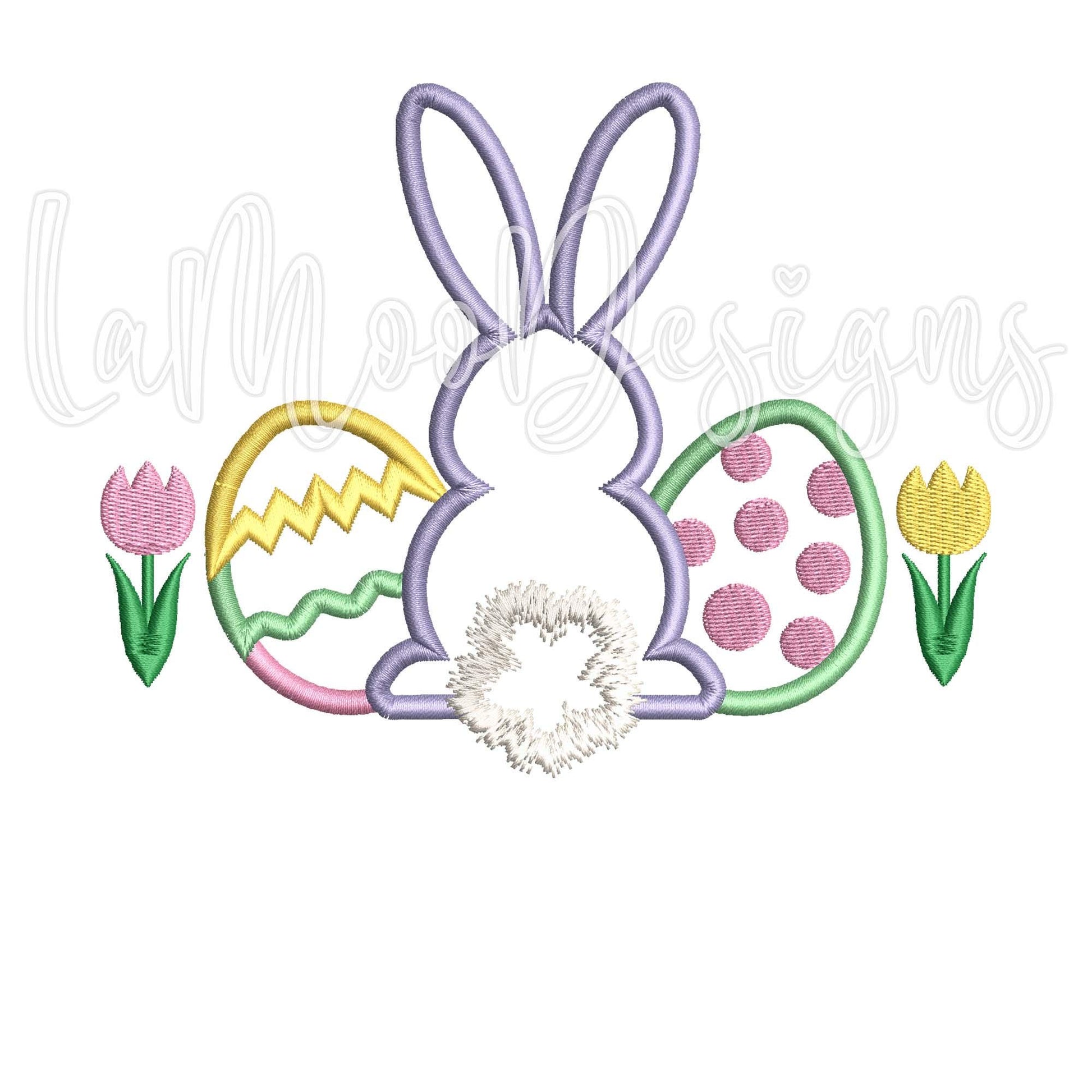 Get ready for Easter with this adorable satin stitch bunny applique embroidery design! Featuring a cute bunny with its fluffy tail surrounded by colorful Easter eggs and tulips, this design is perfect for festive projects. This applique adds a fun and seasonal touch to your creations. Easy to download and compatible with most embroidery machines.