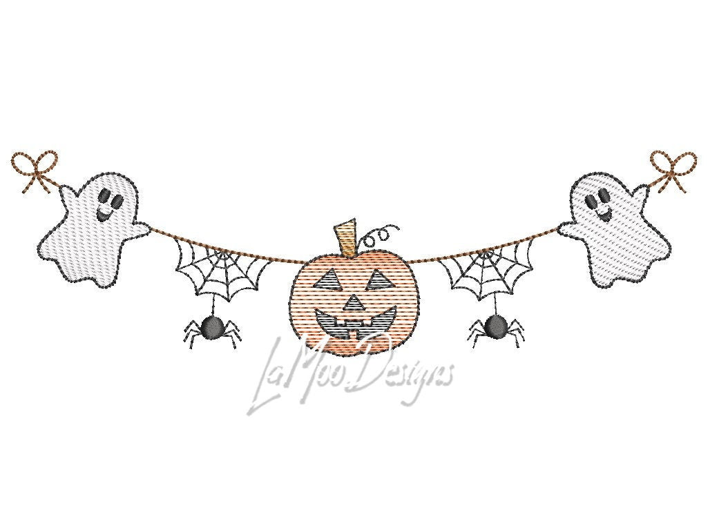 Quick sketch spooky ghost with pumpkins Halloween bunting banner embroidery design.