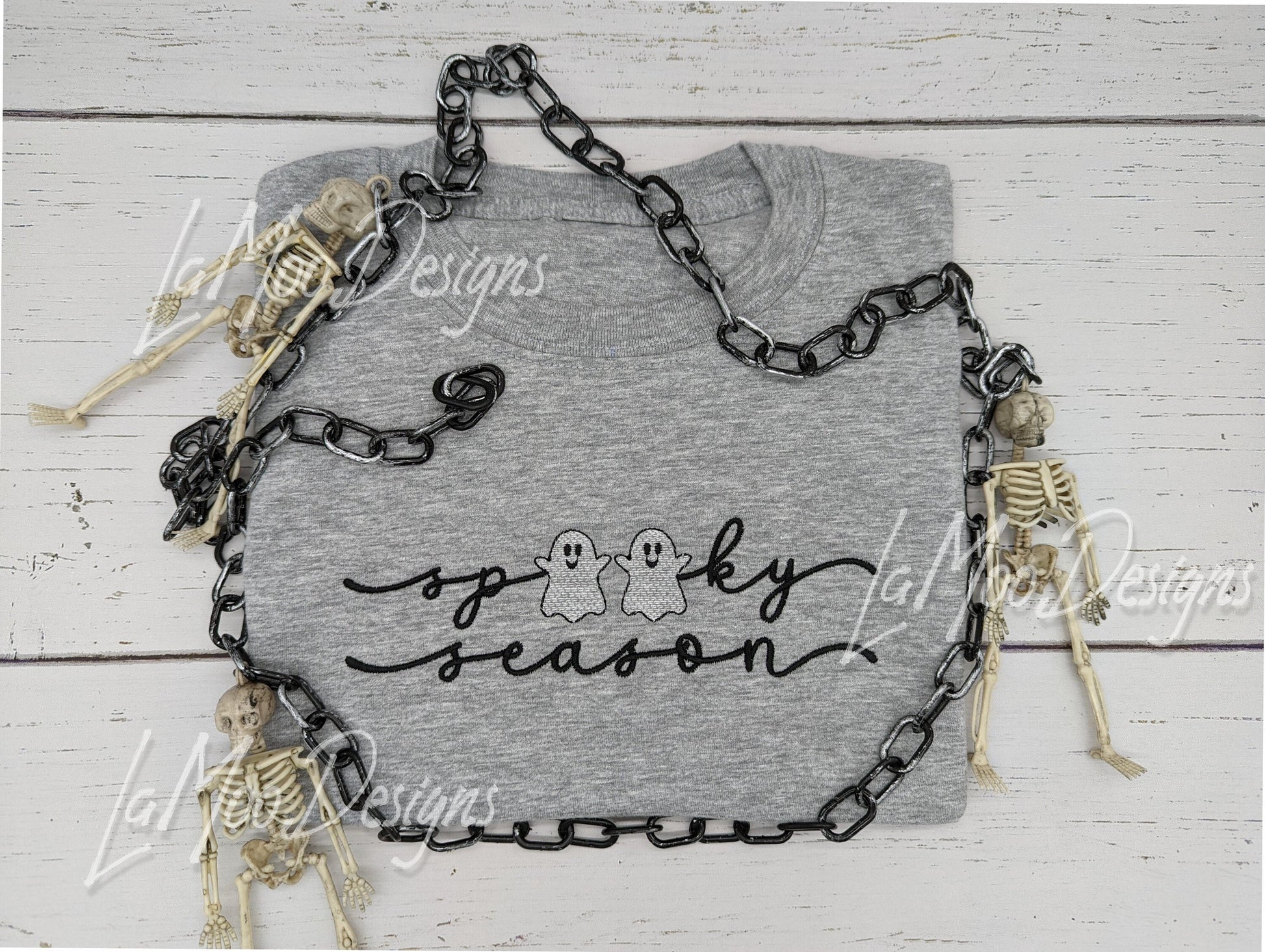 This is a digital file, NOT a physical product. Files will be available in your downloads. You may use it for personal or commercial use on physical products for small businesses only. This design may not be altered or edited to be resold. You MAY NOT share the design or sell the file as your own. Cute ghost spooky season embroidery design, Halloween sketch embroidery design, thin script spooky season,