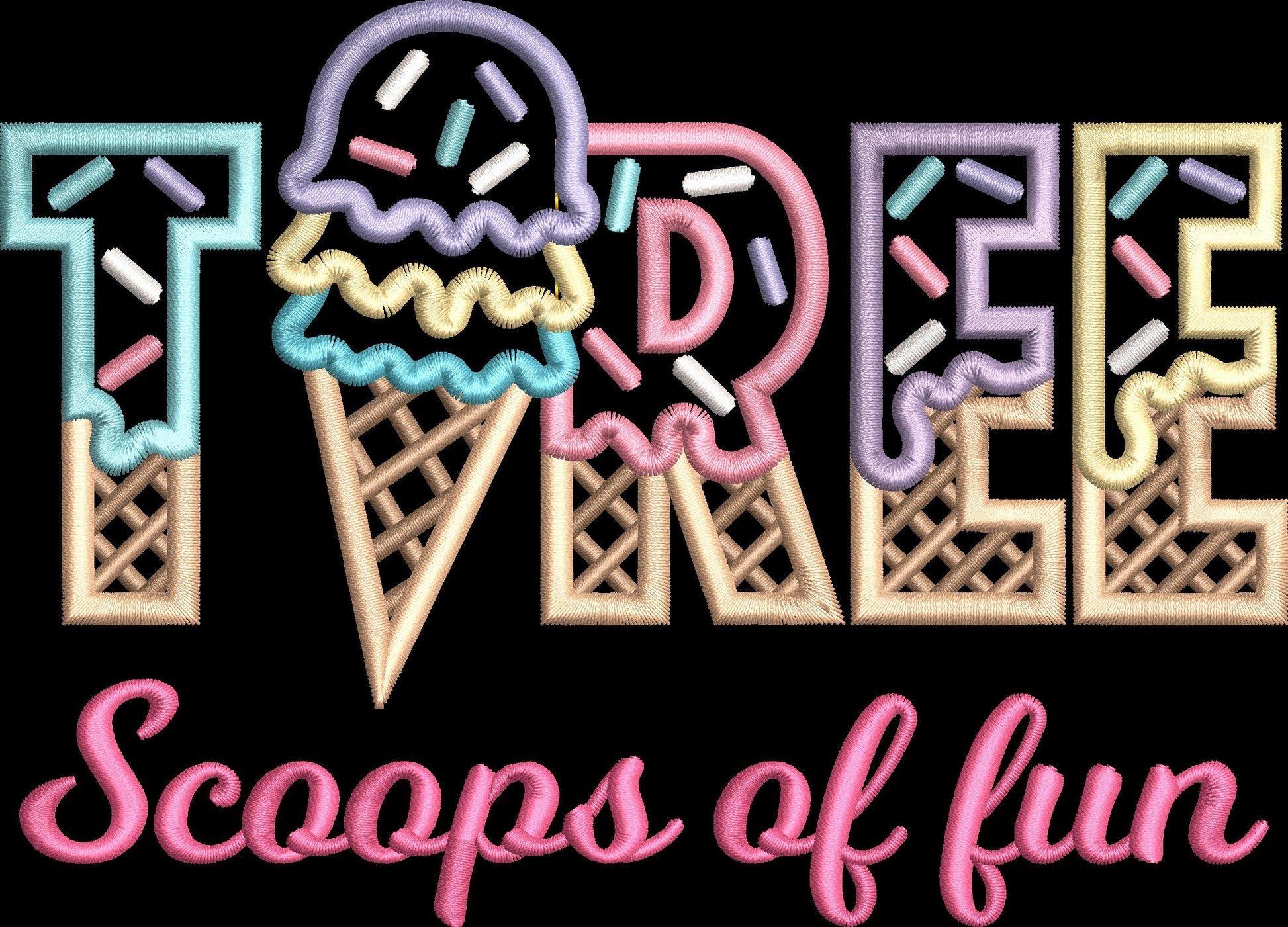 THREE scoops of fun embroidery applique. This delightful embroidery design features a whimsical ice cream cone with three colorful scoops stacked atop. The cone and letters are intricately detailed with a waffle pattern. Each letter designed as ice cream with drips, creating a melting effect, adorned with a different color to suggest a variety of flavors. Sprinkles add a festive touch.
